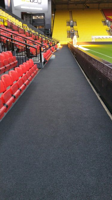 Following on from installing “Palace Red” safetyfall at Crystal Palace FC, London Surfacing received a request from Watford to replace their rubber surface pitchside at Vicarage Road. A gap in their home fixture list presented itself towards the middle of October and LSC moved in to remove the existing wet-pour surface & begin laying approximately 14,000 kilos of Black EPDM. All four touchlines were resurfaced, which covered 1,100m2.